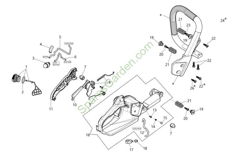 Spare Part Throttle kit Tank and handle Chainsaws Brand Oleo-Mac Required Quantity: 1