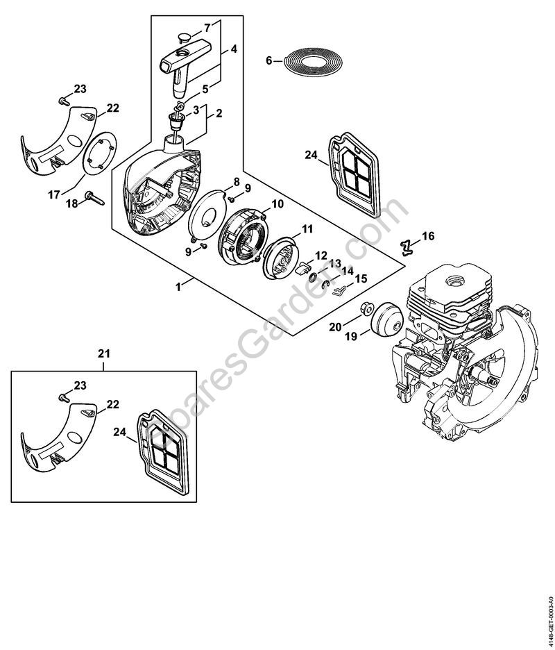 Rewind starter FS 510 C-EMRewind starter Clearing saws (FS) FS 510 C-EM StihlManufacturer: STIHL Email a friendWhen ordering original spare parts for your product Clearing saws (FS) FS 510 C-EM of Stihl, to allow our staff to send you the correct spare parts,enter the year of the machine and, if available, its serial number in the Miscellaneous Notes field on the final page of the cart.OverviewContact UsWhen ordering original spare parts for your product Clearing saws (FS) FS 510 C-EM of Stihl, to allow our staff to send you the correct spare parts,enter the year of the machine and, if available, its serial number in the Miscellaneous Notes field on the final page of the cart.Your name * Your email * Enquiry * Submit1 Rewind starterOriginal spare parts Rewind starter Clearing saws (FS) FS 510 C-EM Stihl Included nr. from 2 a 5, 7 a 15 €92.09 incl tax Qty: Add to cart2 Starter coverOriginal spare parts Starter cover Clearing saws (FS) FS 510 C-EM Stihl Included nr. 3 €49.17 incl tax Qty: Add to cart3 BushingOriginal spare parts Bushing Clearing saws (FS) FS 510 C-EM Stihl €5.56 incl tax Qty: Add to cart4 Grip with starter rope diam. 3 mmOriginal spare parts Grip with starter rope diam. 3 mm Clearing saws (FS) FS 510 C-EM Stihl Included nr. 5 and 7 €16.16 incl tax Qty: Add to cart5 Starter rope diam. 3x1010 mmOriginal spare parts Starter rope diam. 3x1010 mm Clearing saws (FS) FS 510 C-EM Stihl €12.30 incl tax Qty: Add to cart6 Starter rope diam. 3 mm x 30.5 mOriginal spare parts Starter rope diam. 3 mm x 30.5 m Clearing saws (FS) FS 510 C-EM Stihl €46.56 incl tax Qty: Add to cart8 Rewind springOriginal spare parts Rewind spring Clearing saws (FS) FS 510 C-EM Stihl €21.38 incl tax Qty: Add to cart9 Self-tapping screw P3x6Original spare parts Self-tapping screw P3x6 Clearing saws (FS) FS 510 C-EM Stihl €2.20 incl tax Qty: Add to cart10 Rope rotorOriginal spare parts Rope rotor Clearing saws (FS) FS 510 C-EM Stihl €32.46 incl tax Qty: Add to cart11 CarrierOriginal spare parts Carrier Clearing saws (FS) FS 510 C-EM Stihl €11.13 incl tax Qty: Add to cart12 PawlOriginal spare parts Pawl Clearing saws (FS) FS 510 C-EM Stihl €8.00 incl tax Qty: Add to cart13 WasherOriginal spare parts Washer Clearing saws (FS) FS 510 C-EM Stihl €3.27 incl tax Qty: Add to cart14 E-clip 6Original spare parts E-clip 6 Clearing saws (FS) FS 510 C-EM Stihl €1.07 incl tax Qty: Add to cart15 SpringOriginal spare parts Spring Clearing saws (FS) FS 510 C-EM Stihl €3.12 incl tax Qty: Add to cart16 SpringOriginal spare parts Spring Clearing saws (FS) FS 510 C-EM Stihl €3.17 incl tax Qty: Add to cart18 Pan head self-tapping screw IS-D5x24Original spare parts Pan head self-tapping screw IS-D5x24 Clearing saws (FS) FS 510 C-EM Stihl €3.22 incl tax Qty: Add to cart19 Starter cupOriginal spare parts Starter cup Clearing saws (FS) FS 510 C-EM Stihl €23.79 incl tax Qty: Add to cart20 Collar nut M8x1Original spare parts Collar nut M8x1 Clearing saws (FS) FS 510 C-EM Stihl €3.86 incl tax Qty: Add to cart21 Cover plate kitOriginal spare parts Cover plate kit Clearing saws (FS) FS 510 C-EM Stihl Included from nr. 22 to 24 €21.99 incl tax Qty: Add to cart22 CoverOriginal spare parts Cover Clearing saws (FS) FS 510 C-EM Stihl €12.30 incl tax Qty: Add to cart23 Pan head self-tapping screw IS-P4x14Original spare parts Pan head self-tapping screw IS-P4x14 Clearing saws (FS) FS 510 C-EM Stihl €2.68 incl tax Qty: Add to cart24 Air filterOriginal spare parts Air filter Clearing saws (FS) FS 510 C-EM Stihl €24.98 incl tax Qty: Add to cart