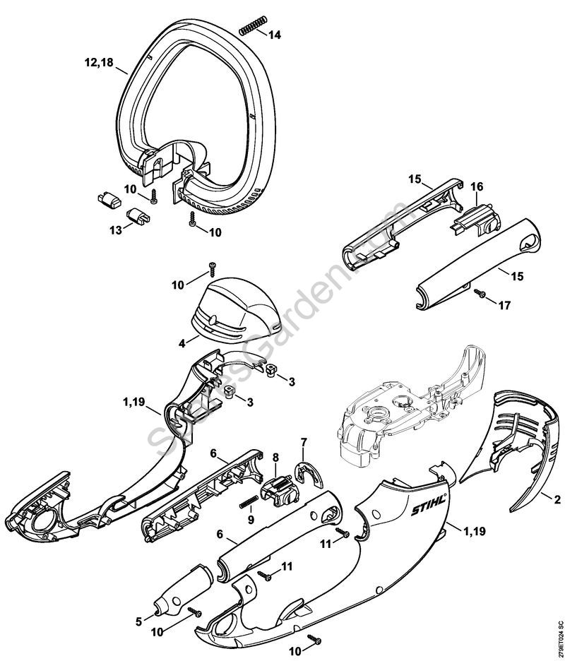 Original spare parts Loop handle Electric hedge trimmers (HSE) HSE 81 Stihl Included nr. 13 and 14
